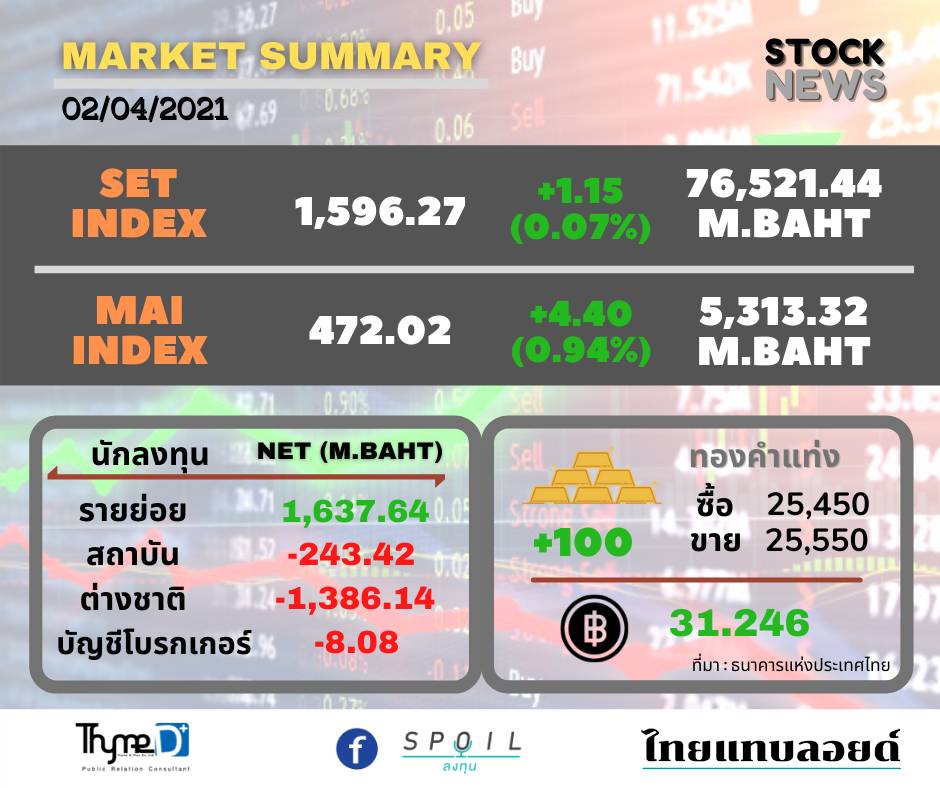 ดัชนีตลาดหุ้นไทยปิดวันนี้ที่ระดับ 1,596.27 จุด เพิ่มขึ้น 1.15 จุด (+0.07%) มูลค่าการซื้อขาย 76,521.44 ล้านบาท