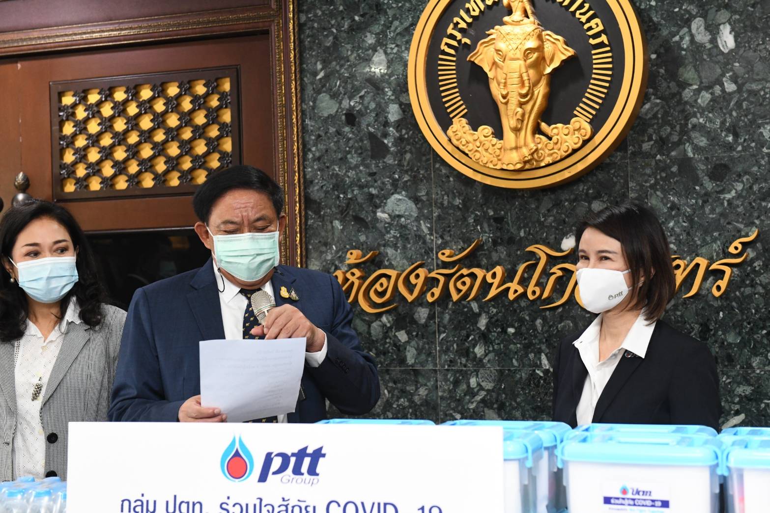 ผู้ว่าราชการกรุงเทพมหานคร กล่าวว่า ในนามของกรุงเทพมหานคร ขอขอบคุณกลุ่มบริษัท ปตท. ที่ได้มอบกล่องอนามัย จำนวน 1,259 ชุด ซึ่งในกล่องบรรจุเจลอาบน้ำ แปรงสีฟัน ยาสีฟัน ยาสระผม สำลีก้านเช็ดหู นอกจากนี้ยังได้มอบน้ำดื่ม เจลแอลกอฮอล์ หน้ากากอนามัย ปลอกหมอน ผ้าปูที่นอน และขอขอบคุณกลุ่มบริษัทที่นอนโลตัส ที่ได้มอบที่นอนและเครื่องนอน จำนวน 300 ชุด เพื่อสนับสนุนภารกิจโรงพยาบาลสนาม โดยกรุงเทพมหานครจะเป็นสื่อกลางนำไปมอบแก่ประชาชนที่เข้ารับการรักษาตัวจากโรคโควิด-19 ในโรงพยาบาลสนามกรุงเทพมหานคร ทั้ง 4 แห่ง ประกอบด้วย โรงพยาบาลผู้สูงอายุบางขุนเทียน เขตบางขุนเทียน รองรับได้ 500 เตียง โรงพยาบาลราชพิพัฒน์ เขตทวีวัฒนา รองรับได้ 200 เตียง สนามกีฬาเฉลิมพระเกียรติ 84 พรรษา บางบอน เขตบางบอน (โรงพยาบาลเอราวัณ 1) รองรับได้ 200 เตียง และศูนย์กีฬาบางกอกอารีนา เขตหนองจอก (โรงพยาบาลเอราวัณ 2) รองรับได้ 350 เตียง ซึ่งอยู่ระหว่างปรับปรุงสถานที่ รองรับผู้ป่วยได้ 1,250 เตียง