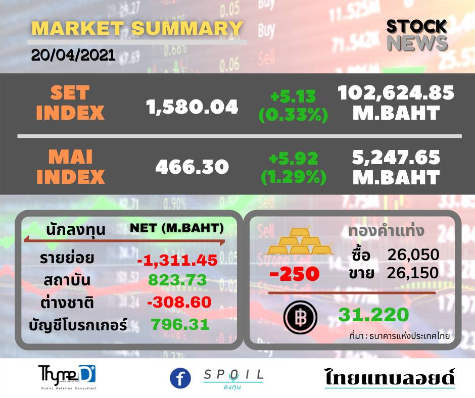 ตลาดหลักทรัพย์ปิดวันนี้ที่ระดับ 1,580.04 จุด เพิ่มขึ้น 5.13 จุด (+0.33%) มูลค่าการซื้อขาย 102,624.85 ล้านบาท