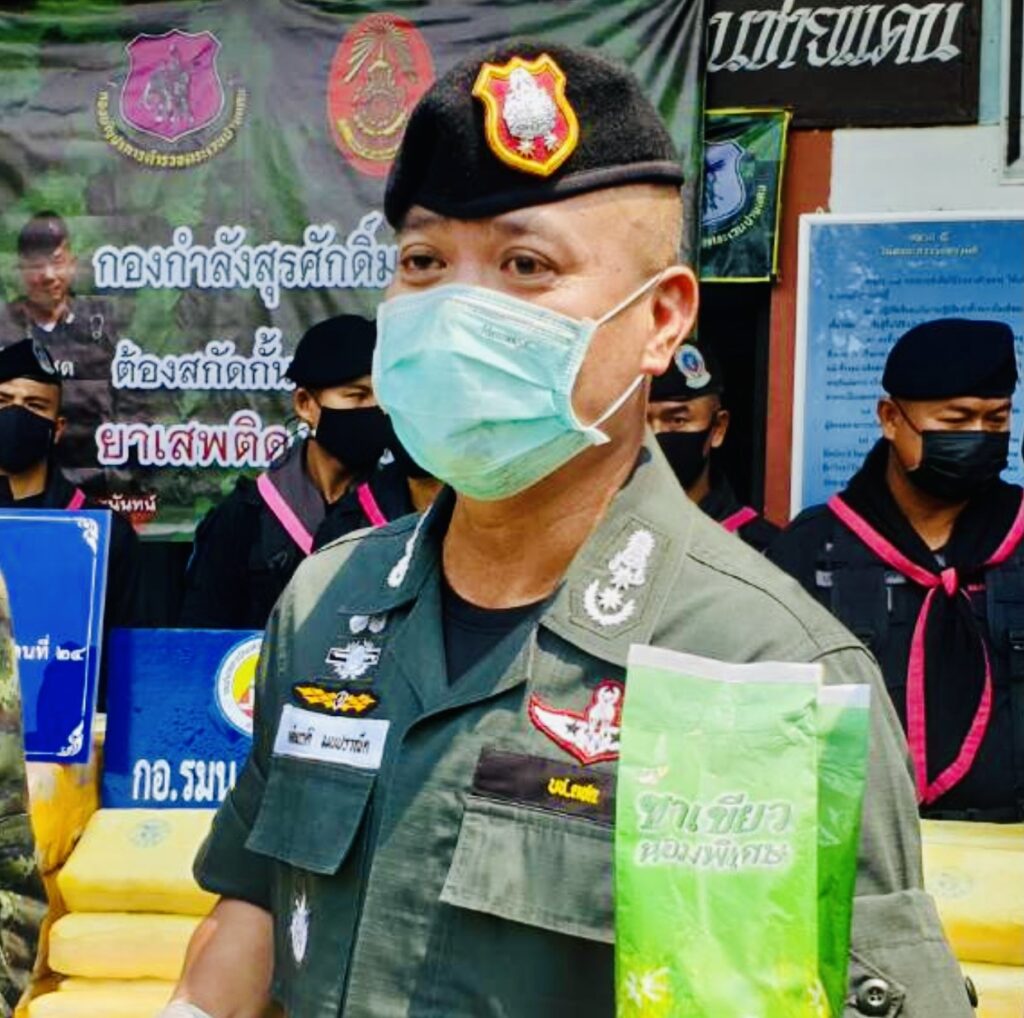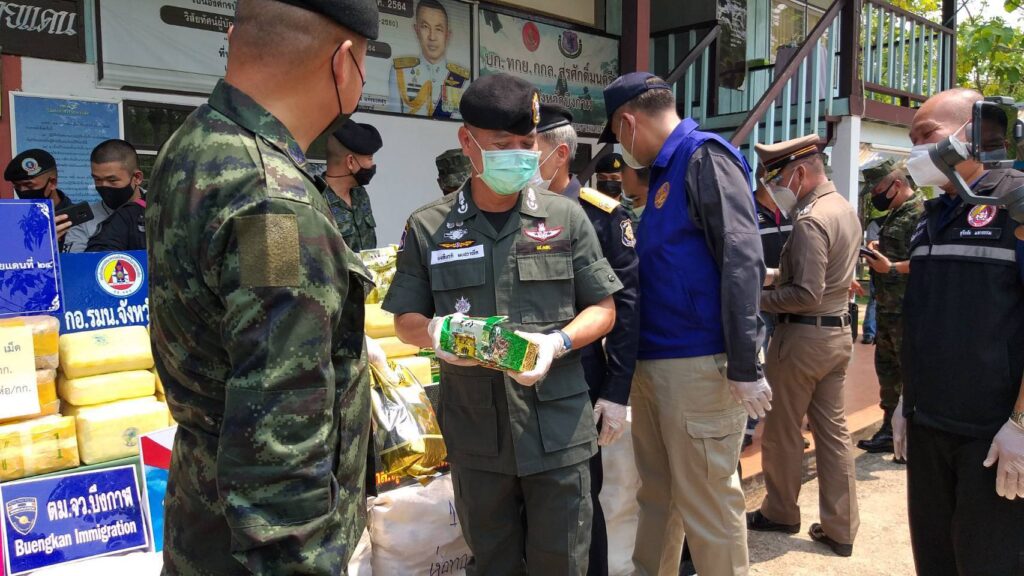 ได้จึงสั่งการให้ บูรณาการด้านการข่าว พร้อมบูรณาการกำลัง ร่วมกับ เจ้าหน้าที่ ร้อย.ฉก.ทพ.2106 ฉก.ทพ.21 พร้อมด้วยเจ้าหน้าที่ตำรวจ กก.สืบสวน ภ.จว.บึงกาฬ, เจ้าหน้าที่ตำรวจ ชุดสืบสวน สภ.ปากคาด, เจ้าหน้าที่ตำรวจน้ำบึงกาฬ, เจ้าหน้าที่ทหารเรือ สถานีเรือรัตนวาปี นรข.เขตหนองคาย, เจ้าหน้าที่หน่วยข่าวกรองทางทหาร, เจ้าหน้าที่ฝ่ายปกครองอำเภอ, เจ้าหน้าที่ตำรวจ ตม.จว.บึงกาฬ โดยแบ่งกำลังดักชุ่มในพื้นที่ล่อแหลมที่คาดว่า จะมีการลักลอบส่งยาเสพติดตลอดแนวตามลำน้ำโขง พื้นที่บ้านต้าย ถึง บ้านเวินโดน ต.ปากคาด อ.ปากคาด จ.บึงกาฬ จนกระทั่งเวลา ประมาณ 19.40 น. พบเห็นบุคลต้องสงสัยแบกกระสอบมาวางไว้บริเวณข้างกอไผ่ ท้ายสวนยางพาราใกล้กับ ริมแม่น้ำโขง บ้านเวินโดน จากนั้นบุคลต้องสงสัยได้รีบวิ่งลงเรือข้ามไปยังฝั่ง สปป.ลาว จึงได้เข้าตรวจสอบ พบว่าเป็นกระสอบสีน้ำเงิน จำนวน 2 ใบ จากประสบการณ์เชื่อได้ว่า ภายในกระสอบทั้งสองใบเป็นยาเสพติด จึงวางกำลังดักซุ่มบริเวณโดยรอบ