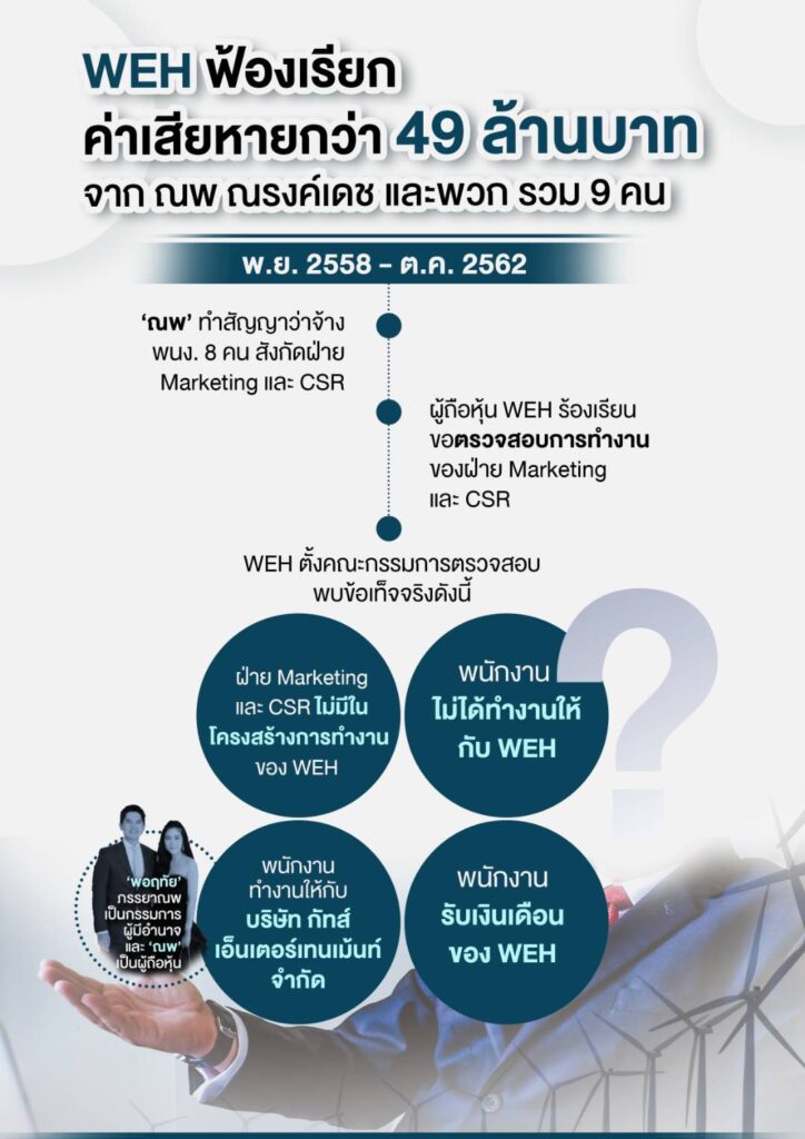 ทั้งนี้ คำฟ้องระบุว่าจำเลยได้ทุจริตฉ้อฉล โดยทำสัญญากำหนดเงินเดือนให้นางพอฤทัยเดือนละ 500,000 บาท ตั้งแต่วันที่ 5 พ.ย.2558 – 11 ส.ค.2563 เมื่อรวมกับโบนัสประจำปี ทำให้นางพอฤทัยได้รับเงินจากวินด์ไปประมาณ 32 ล้านบาท เมื่อรวมค่าเสียหายลักษณะเดียวกันที่บริษัทจ่ายให้จำเลย ที่ 3 – 9 ไป จึงมีมูลค่ารวม 49.86 ล้านบาท