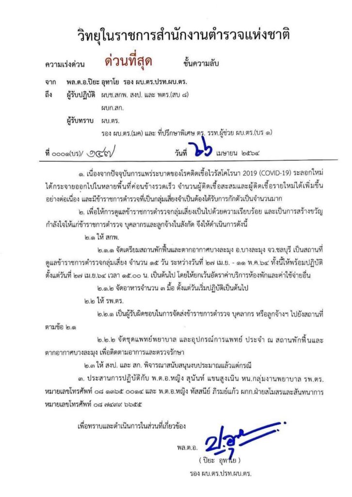 ให้ สกพ. จัดเตรียมสถานพักฟื้นและตากอากาศบางละมุง อ.บางละมุง จังหวัดชลบุรี เป็นสถานที่ ให้ดูแลข้าราชการตำรวจกลุ่มเสี่ยง จำนวน 15 วัน ระหว่างวันที่ 27 เม.ย. – 11 พ.ค. 64 ทั้งนี้ให้พร้อมปฏิบัติ ตั้งแต่วันที่ 27 เมษายน 2564 เวลา 15.00 น. เป็นต้นไป โดยให้ยกเว้นอัตราค่าบริการห้องพักและค่าใช้จ่ายอื่น โดยจัดอาหารจำนวน 3 มื้อ ตั้งแต่วันเริ่มปฏิบัติเป็นต้นไป