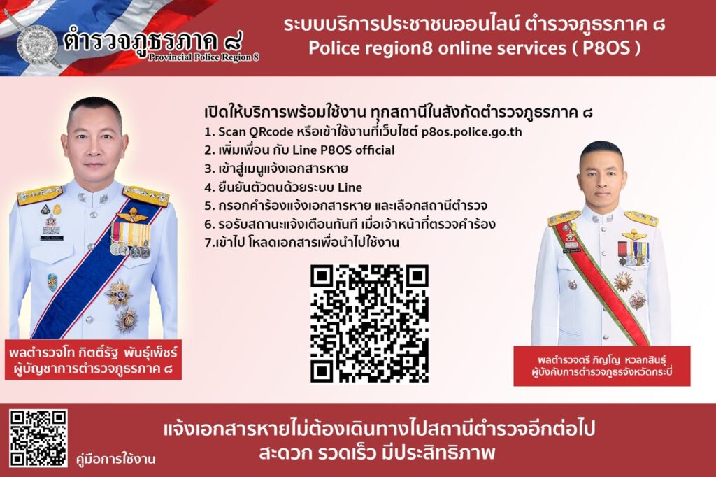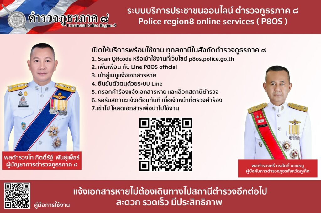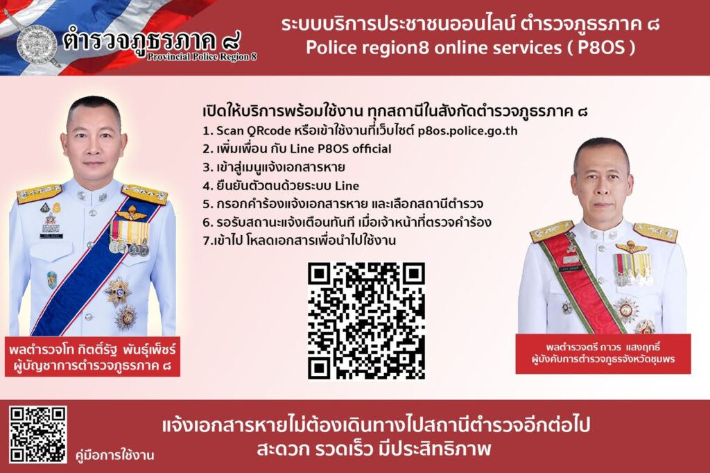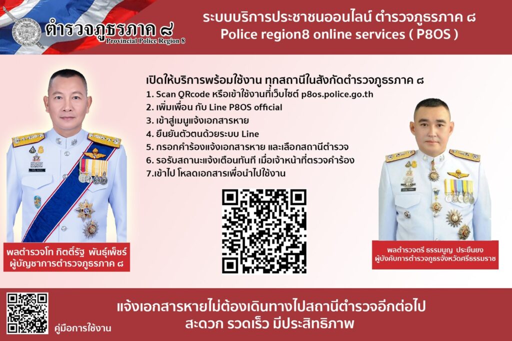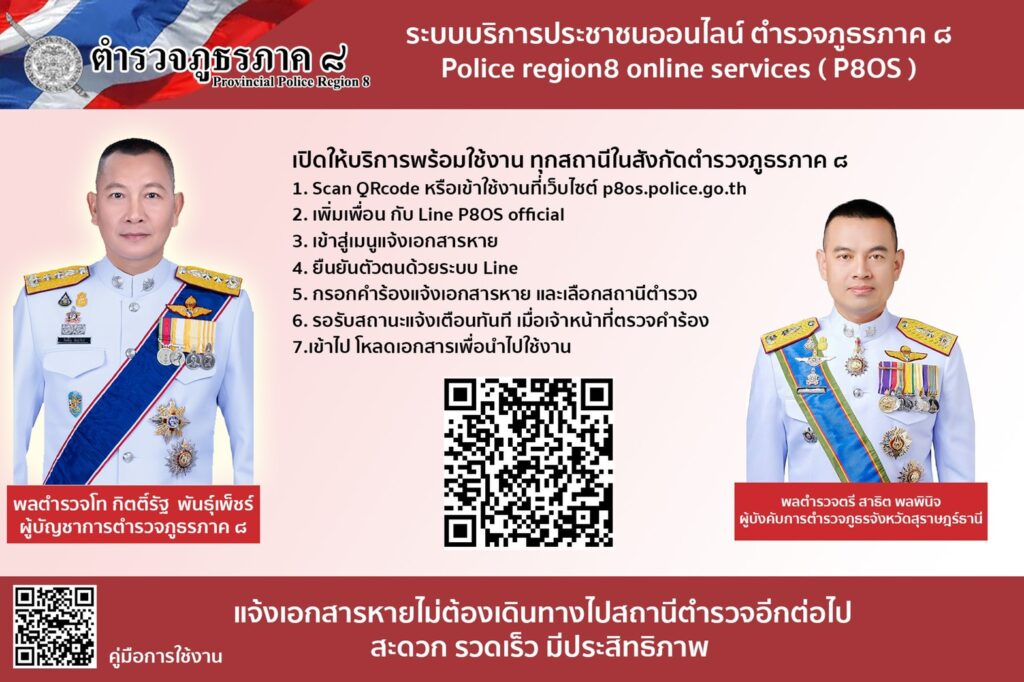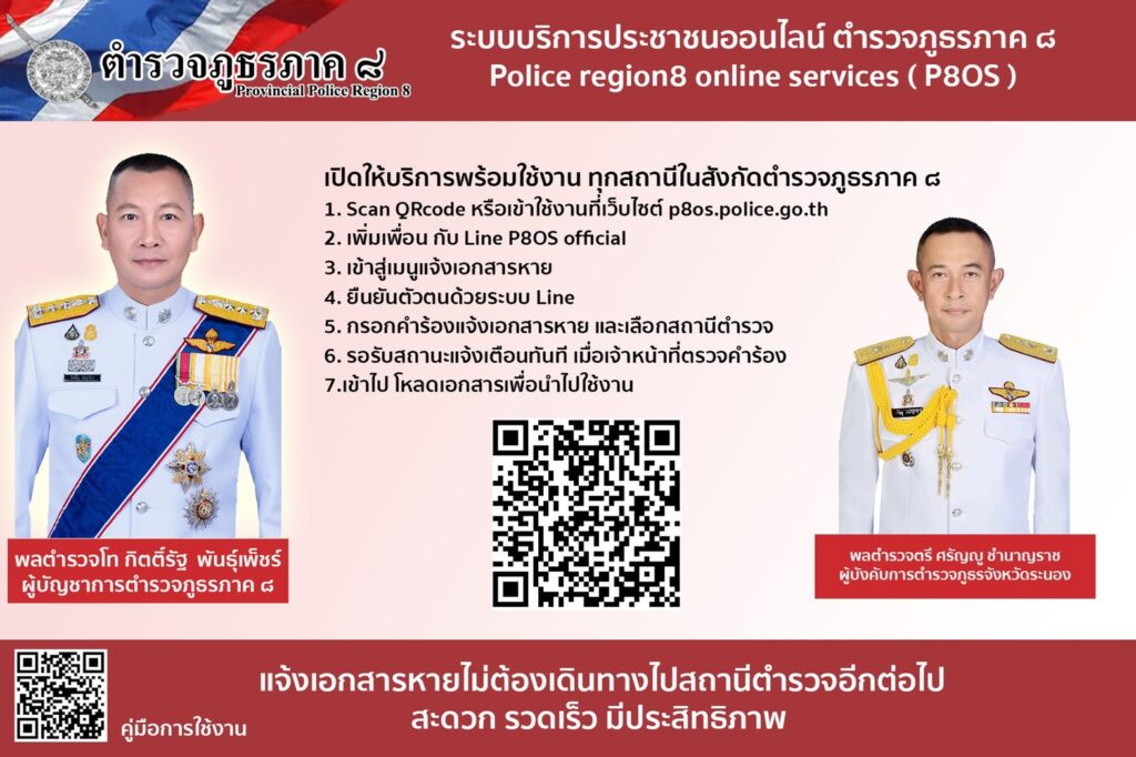 เมื่อวันที่ 4 มิถุนายน 2564 พล.ต.ท.กิตติ์รัฐ พันธุ์เพ็ชร์ ผู้บัญชาการตำรวจภูธรภาค 8 (ผบช.ภ.8) เปิดเผยว่า ตนพร้อม รองผู้บัญชาการ และผู้บังคับการในสังกัด ตำรวจภูธรภาค 8 ทุกนาย ได้ขานรับตามนโยบายและวิสัยทัศน์ของ พล.ต.อ.สุวัฒน์ แจ้งยอดสุข ผู้บัญชาการตำรวจแห่งชาติ (ผบ.ตร.) ที่ต้องการเห็นการรับแจ้งเอกสารหายสามารถทำที่ไหนก็ได้ในประเทศไทย ที่ให้ไว้เมื่อเดือนตุลาคม 2563 กองบัญชาการตำรวจภูธรภาค 8 (บช.ภ.8) ได้เปิดโครงการระบบบริการประชาชนแจ้งความเอกสารหายทางออนไลน์ Police region 8 Online Services ( P80S ) โดยให้ทุกสถานีตำรวจภูธร (สภ.) ในสังกัด กองบัญชาการตำรวจภูธรภาค 8 (บช.ภ.8) เริ่มให้บริการรับแจ้งเอกสารหาย ตั้งแต่วันที่ 1 มิถุนายน 2564 นี้เป็นต้นไป