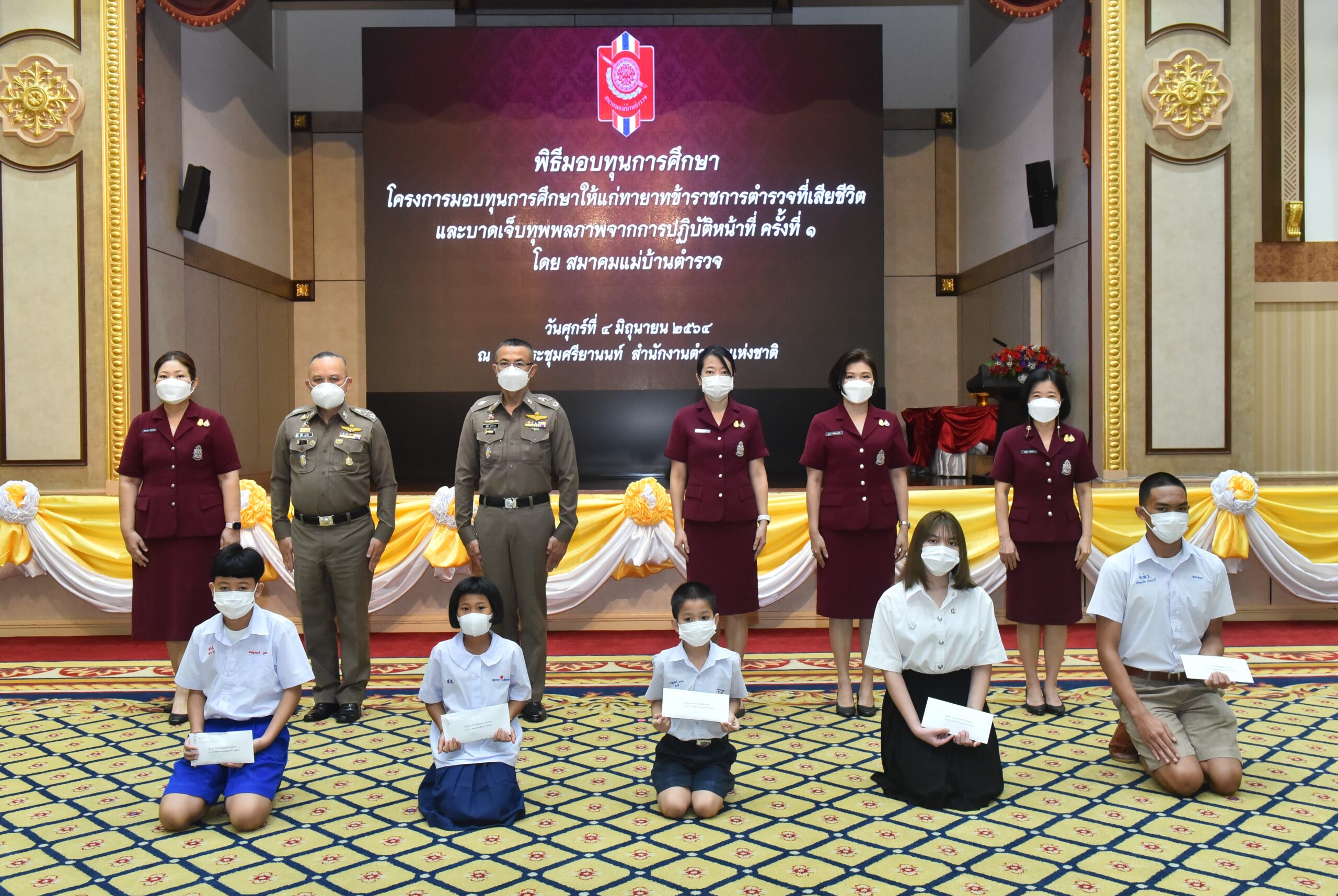 วันศุกร์ที่ 4 มิถุนายน 2564 ที่ห้องศรียานนท์ สำนักงานตำรวจแห่งชาติ พล.ต.อ. สุวัฒน์ แจ้งยอดสุข ผู้บัญชาการตำรวจแห่งชาติ (ผบ.ตร.) ประธานในพิธี พร้อมด้วยคุณรัตนาภรณ์ สีวลีพันธ์ นายกสมาคมแม่บ้านตำรวจ ได้ร่วมในพิธีมอบทุนการศึกษา ให้แก่ทายาทข้าราชการตำรวจที่เสียชีวิต และบาดเจ็บทุพลภาพจากการปฏิบัติหน้าที่ ครั้งที่ 1 โดยสมาคมแม่บ้านตำรวจ ประจำปี พ.ศ. 2564