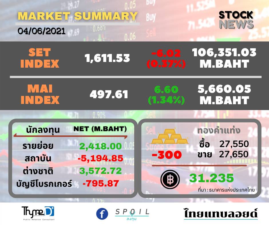 ตลาดหลักทรัพย์ปิดวันนี้ที่ระดับ 1,611.53 จุด ลดลง 6.02 จุด (-0.37%) มูลค่าการซื้อขาย 106,351.03 ล้านบาท