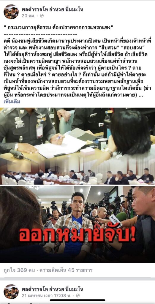เมื่อวันที่ 6 มิถุนายน 2564 ผู้สื่อข่าวไทยแทบลอยด์รายงานว่า พล.ต.ท.อำนวย นิ่มมะโน อดีตผู้บัญชาการตำรวจภูธรภาค 1 (อดีต ผบช.ภ.1) ผู้เชี่ยวชาญด้านสืบสวนสอบสวน ได้โพสต์แสดงความคิดเห็นถึง ”คดีน้องชมพู่” ในเฟสบุ๊ค มีใจความว่า : “กระบวนการยุติธรรม ต้องปราศจากการแทรกแซง” คดี ‘น้องชมพู่’ เสียชีวิตเกิดมานานประมาณปีเศษ เป็นหน้าที่ของเจ้าหน้าที่ตำรวจ และพนักงานสอบสวนที่จะต้องทำการ “สืบสวน” “สอบสวน” ให้ได้ข้อยุติว่า น้องชมพู่ เสียชีวิตเอง หรือมีผู้ทำให้เสียชีวิต ถ้าเสียชีวิตเองจะไม่เป็นความผิดอาญา พนักงานสอบสวนเพียงแค่ทำสำนวนชันสูตรพลิกศพ เพื่อพิสูจน์ให้ได้ข้อเท็จจริงว่า ผู้ตายเป็นใคร ? ตายที่ไหน ? ตายเมื่อไหร่ ? ตายอย่างไร ? ก็เท่านั้น แต่ถ้ามีผู้ทำให้ตายจะเป็นหน้าที่ของพนักงานสอบสวนที่จะต้องรวบรวมพยานหลักฐานเพื่อ พิสูจน์ให้เห็นความผิด ว่า มีการกระทำความผิดอาญาฐานใดเกิดขึ้น (ฆ่าผู้อื่น หรือกระทำโดยประมาทจนเป็นเหตุ ให้ผู้อื่นถึงแก่ความตาย) และพิสูจน์ให้ได้ว่าใครคือผู้กระทำความผิด เพื่อติดตามจับกุมตัวมาดำเนินคดีต่อไป