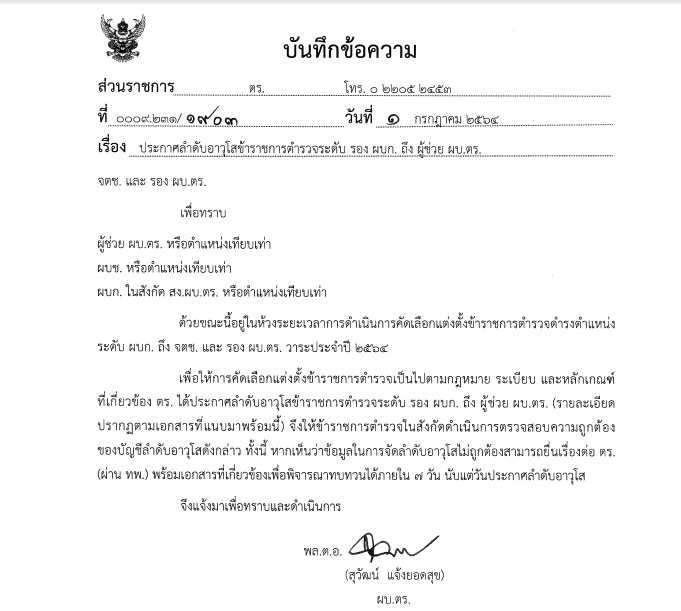 เมื่อวันที่ 1 กรกฎาคม 2564 ที่สำนักงานตำรวจแห่งชาติ (ตร.) มีรายงานว่า พล.ต.อ.สุวัฒน์ แจ้งยอดสุข ผู้บัญชาการตำรวจแห่งชาติ (ผบ.ตร.) ลงนามในบันทึกข้อความ ที่ 0009.231/1903 ลง 1 กรกฎาคม 2564 ประกาศลำดับอาวุโสข้าราชการตำรวจ ตำแหน่งระดับ รองผู้บังคับการ (รอง ผบก.) ถึงผู้ช่วยผู้บัญชาการตำรวจแห่งชาติ (ผู้ช่วย ผบ.ตร.) ใจความว่า ด้วยขณะนี้อยู่ในห้วงระยะเวลาการดำเนินการคัดเลือกแต่งตั้งข้าราชการตำรวจ ดำรงตำแหน่งรองดับ ผู้บังคับการ (ผบก.) ถึงจเรตำรวจแห่งชาติ (จตช.) และรองผู้บัญชาการตำรวจแห่งชาติ (รอง ผบ.ตร.) วาระประจำปี 2564 ดังนั้น เพื่อให้การคัดเลือกแต่งตั้งข้าราชการตำรวจเป็นไปตามกฎหมาย ระเบียบ และหลักเกณฑ์ ตร. จึงประกาศลำดับความอาวุโสข้าราชการตำรวจระดับรอง ผู้บังคับการ (รอง ผบก.) ถึงผู้ช่วยผู้บัญชาการตำรวจแห่งชาติ (ผู้ช่วย ผบ.ตร.) มาเพื่อทราบ และแจ้งให้ข้าราชการตำรวจในสังกัดตรวจสอบความถูกต้องของบัญชีลำดับอาวุโสดังกล่าว ทั้งนี้ หากเห็นว่าข้อมูลในการจัดลำดับอาวุโสไม่ถูกต้อง สามารถยื่นเรื่องต่อ ตร. (ผ่าน ทพ.) พร้อมเอกสารที่เกี่ยวข้องเพื่อพิจารณาทบทวนได้ภายใน 7 วันนับแต่วันประกาศลำดับอาวุโส