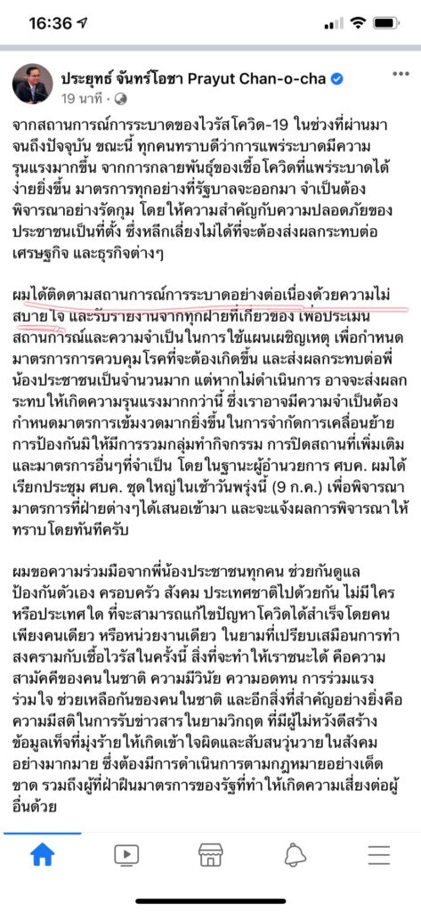 เมื่อวันที่ 8 กรกฎาคม 2564 ผู้สื่อข่าวไทยแทบลอยด์ รายงานว่า เฟซบุ๊ก ที่ใช้ชื่อ ประยุทธ์ จันทร์โอชา Prayut Chan-o-cha ได้โพสต์ ข้อความถึงสถานการณ์การระบาดของโรคติดเชื้อโควิด-19 แจงเรียกประชุมเพื่อพิจารณามาตรการ ขอสัญญาจะดูแลทุกคนอย่างดี