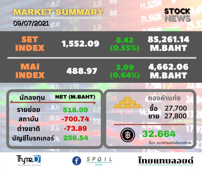 ตลาดหลักทรัพย์ ปิดวันนี้ที่ระดับ 1,552.09 จุด เพิ่มขึ้น 8.42 จุด (+0.55%) มูลค่าการซื้อขาย 85,261.14 ล้านบาท