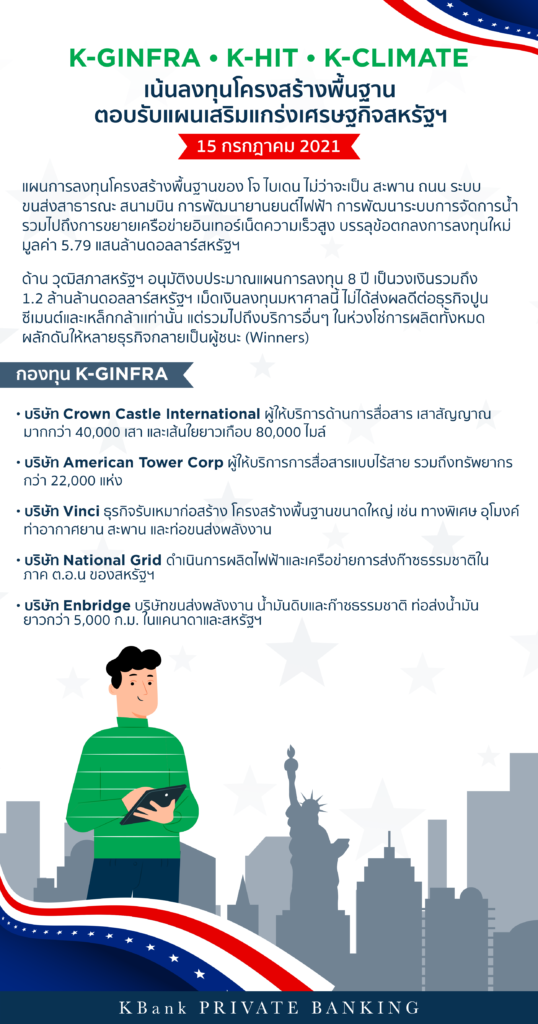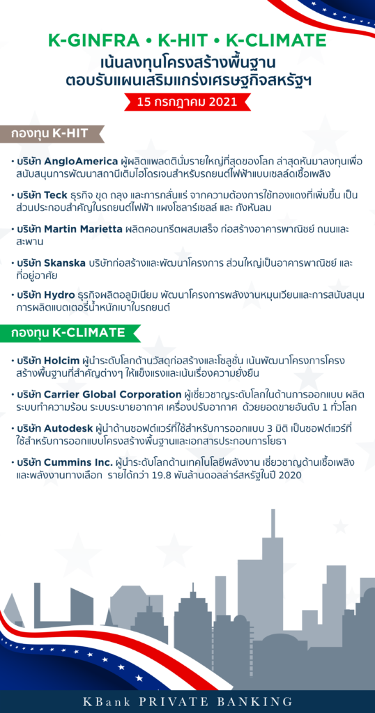 KBank Private Banking (เคแบงก์ ไพรเวทแบงกิ้ง) เผยมุมมองเชิงบวกและโอกาสการลงทุนครั้งสำคัญหลังจากการประกาศแผนลงทุนโครงสร้างพื้นฐานขนาดใหญ่ฉบับใหม่ของประธานาธิบดี โจ ไบเดน ของสหรัฐฯ ผ่านกองทุนเปิดเค โกลบอล อินฟราสตรัคเจอร์ (K-GINFRA) กองทุนเปิดเค โกลบอล ไฮ อิมแพ็ค ธีมาติก (K-HIT) และ กองทุนเปิดเค ไคลเมท ทรานซิชั่น (K-CLIMATE)