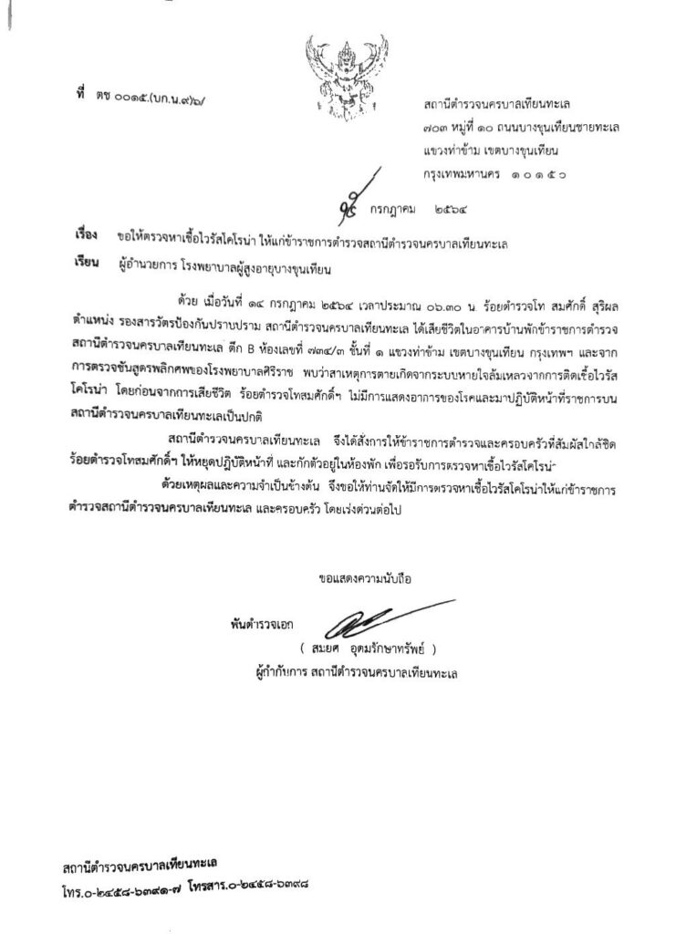 เมื่อวันที่ 15 กรกฎาคม 2564 พ.ต.อ.สมยศ อุดมรักษาทรัพย์ ผกก.สน.เทียนทะเล ได้ทำบันทึกข้อความถึงผู้อำนวยการโรงพยาบาลผู้สูงอายุบางขุนเทียน เพื่อขอให้ตรวจหาเชื้อไวรัสโควิด-19 ให้แก่ข้าราชการตำรวจ สน.เทียนทะเล