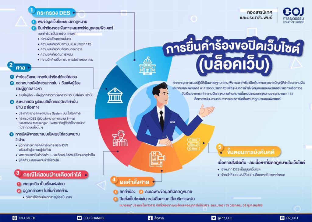 เมื่อวันที่ 26 กรกฎาคม 2564 นายมุขเมธิน กลั่นนุรักษ์ ผู้พิพากษาหัวหน้าคณะแผนกคดีค้ามนุษย์ ซึ่งได้รับมอบหมายโดยตรงจากอธิบดีผู้พิพากษาศาลอาญา รับผิดชอบคดียื่นคำร้องขอปิดเว็บไซต์ ระงับการเข้าถึงข้อมูลบนคอมพิวเตอร์ กล่าวถึงการกำหนดแนวทางมาตรฐานการพิจารณาของศาลอาญา หลังจากมีการยื่นคำร้องสู่ศาลอาญาต่อเนื่อง นับตั้งแต่ พ.ร.บ.ว่าด้วยการกระทำความผิดเกี่ยวกับคอมพิวเตอร์ พ.ศ.2550 บังคับใช้ว่า จากกรณีศึกษาการยื่นคำร้องของกระทรวงดิจิทัลเพื่อเศรษฐกิจและสังคม หรือ DES กับบริษัท วอยซ์ทีวี จำกัด ในคดีหมายเลขแดง พศ.339/2563 ที่ขอให้ปิดทีวีทั้งช่อง ซึ่งตามรัฐธรรมนูญฯ มาตรา 35 วรรคสอง เขียนว่าห้ามรัฐปิดสื่อมวลชนเพื่อริดรอนสิทธิเสรีภาพการนำเสนอข่าวสาร