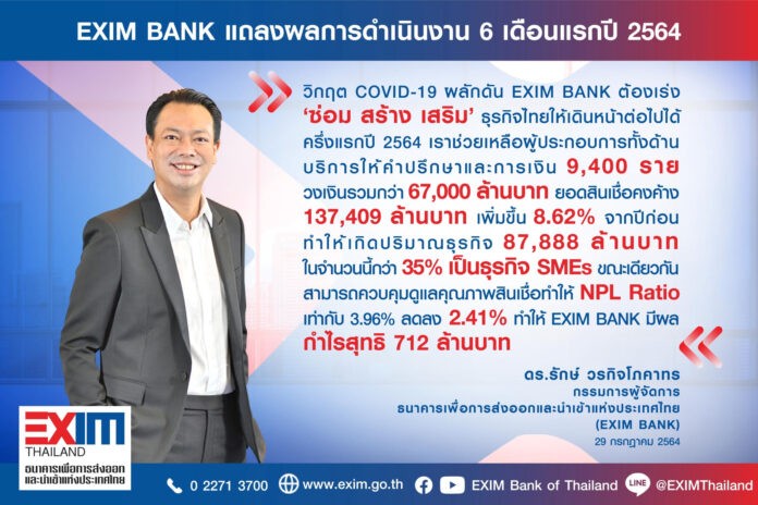 EXIM BANK แถลงผลการดำเนินงานครึ่งแรกปี 2564 ช่วยเหลือผู้ประกอบการทั้งด้านการให้คำปรึกษาและบริการทางการเงินในวิกฤตโควิด-19 ได้ 9,400 ราย วงเงินรวมกว่า 67,000 ล้านบาท ยอดสินเชื่อคงค้าง 137,409 ล้านบาท เพิ่มขึ้น 8.62% จากปีก่อน ทำให้เกิดปริมาณธุรกิจ 87,888 ล้านบาท ในจำนวนนี้กว่า 35% เป็นธุรกิจ SMEs สินเชื่อโครงการระหว่างประเทศเพิ่มขึ้นกว่า 17% และสินเชื่อสนับสนุนการส่งออกและลงทุนของไทยไป CLMVเพิ่มขึ้นกว่า 18% ขณะเดียวกันสามารถควบคุมดูแลคุณภาพสินเชื่อ ทำให้อัตราส่วนสินเชื่อด้อยคุณภาพต่อเงินให้สินเชื่อเท่ากับ 3.96% ลดลง 2.41% ทำให้ EXIM BANK มีผลกำไรสุทธิ 712 ล้านบาท
