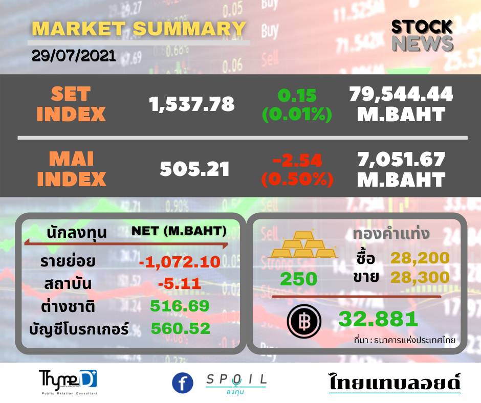 ดัชนีตลาดหลักทรัพย์ ปิดวันนี้ที่ระดับ 1,537.78 จุด เพิ่มขึ้น 0.15 จุด (+0.01%) มูลค่าการซื้อขาย 79,544.44 ล้านบาท