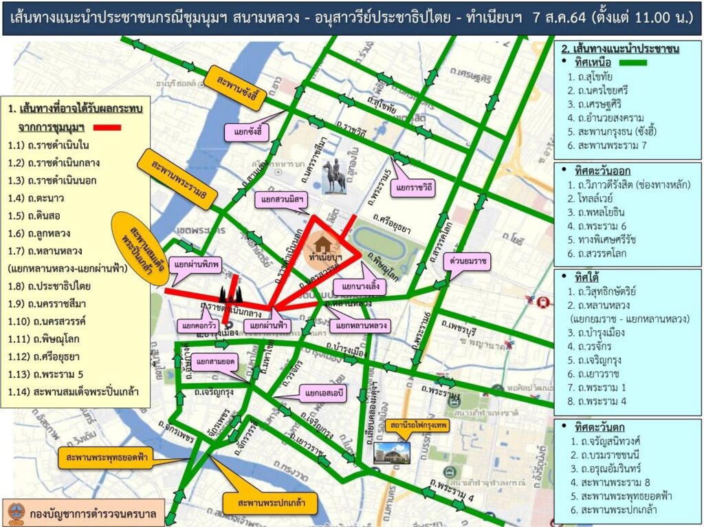 เนื่องด้วยบริเวณการรวมกลุ่มเพื่อชุมนุมฯ อยู่บริเวณถนนราชดาเนิน ซึ่งเป็นเส้นทางสายหลัก ที่ประชาชน ใช้ในการสัญจร ดังน้ันเพื่อให้เกิดความสะดวกในการเดินทางของพี่น้องประชาชน บช.น. จึงขอแจ้งข้อมูลข่าวสารด้าน การจราจร เพื่อประกอบในการวางแผนการเดินทาง และขอให้หลีกเลี่ยงเส้นทางตั้งแต่เวลา 11.00 น. เป็นต้นไปจนเสร็จสิ้น