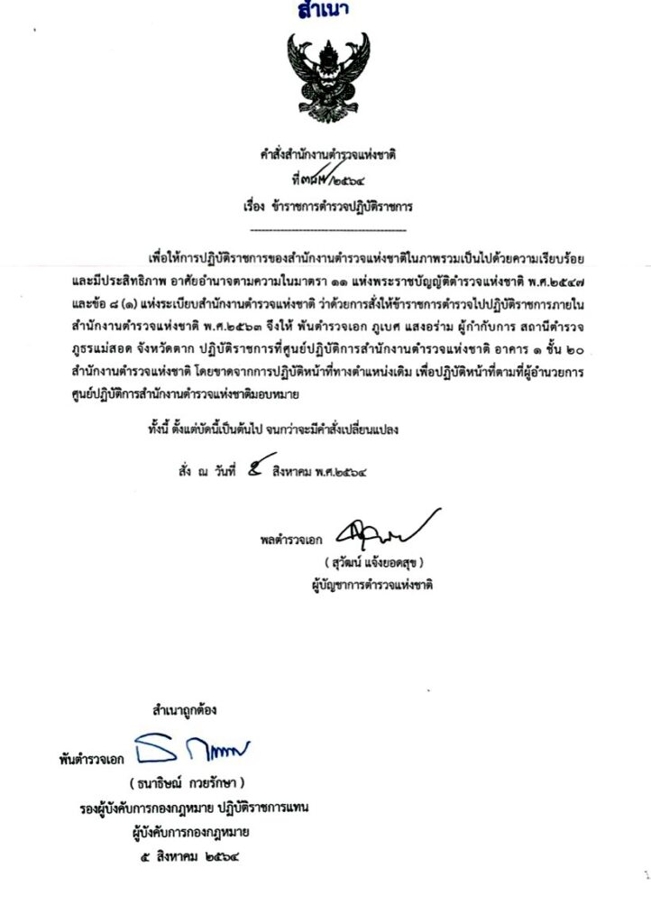 วันที่ 6 สิงหาคม 2564 ที่สำนักงานตำรวจแห่งชาติ (ตร.) พล.ต.อ.สุวัฒน์ แจ้งยอดสุข ผู้บัญชาการตำรวจแห่งชาติ (ผบ.ตร.) มีหนังสือคำสั่งสำนักงานตำรวจแห่งชาติ ที่ 387/2564 ให้ พ.ต.อ. ภูเบศ แสงอร่าม ผู้กำกับการ สถานีตำรวจ ภูธรแม่สอด จังหวัดตาก ปฏิบัติราชการที่ศูนย์ปฏิบัติการสำนักงานตำรวจแห่งชาติ อาคาร 1 ชั้น 2 ตร.หรือ ศปก.ตร. โดยขาดจากการปฏิบัติหน้าที่ทางตำแหน่งเดิม เพื่อปฏิบัติหน้าที่ตามที่ผู้อำนวยการ ศปก.ตร.มอบหมาย ทั้งนี้ ตั้งแต่บัดนี้เป็นต้นไป จนกว่าจะมีคำสั่งเปลี่ยนแปลง