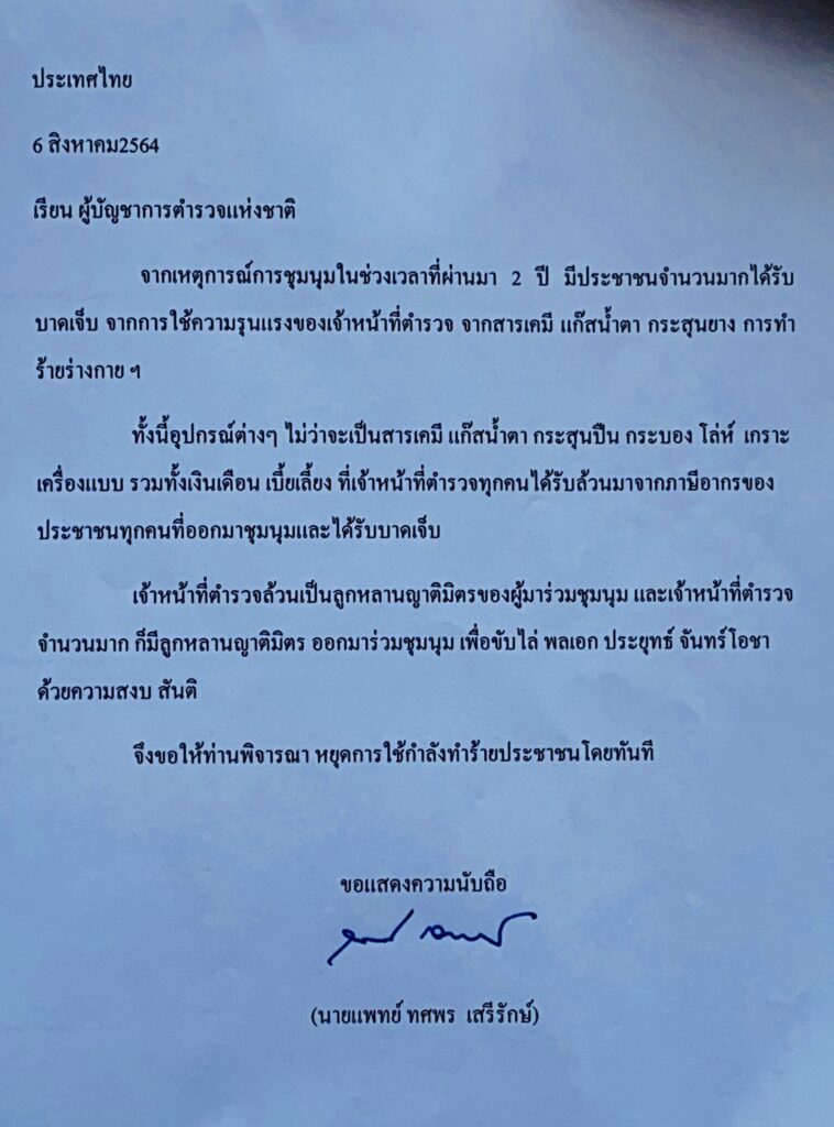 เมื่อเวลา 16.30 น. วันที่ 6 สิงหาคม 2564 ที่สำนักงานตำรวจแห่งชาติ (ตร.) นายแพทย์ทศพร เสรีรักษ์ เข้ายื่นหนังสือถึงพล.ต.อ.สุวัฒน์ แจ้งยอดสุข ผู้บัญชาการตำรวจแห่งชาติ (ผบ.ตร.) กรณีมีผู้บาดเจ็บจากการยิงด้วยกระสุนยางจากการปฏิบัติของเจ้าหน้าที่ตำรวจ โดยมี พ.ต.อ.ชุมวร ชมะทัต รอง ผบก.อต. นายตำรวจเวรอำนวยการเป็นตัวแทนรับมอบหนังสือ