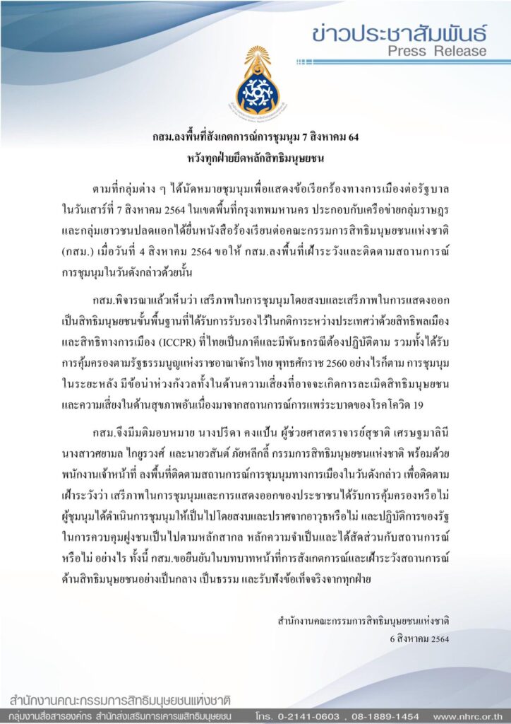 เมื่อวันที่ 6 สิงหาคม 2564 ผู้สื่อข่าวไทยแทบลอยด์ รายงานว่า คณะกรรมการสิทธิมนุษยชนแห่งชาติ (กสม.) แจ้งว่า ตามที่กลุ่มต่าง ๆ ได้นัดหมายชุมนุมเพื่อแสดงข้อเรียกร้องทางการเมืองต่อรัฐบาล ในวันที่ 7 สิงหาคม 2564 ประกอบกับเครือข่ายกลุ่มราษฎรและกลุ่มเยาวชนปลดแอกได้ยื่นหนังสือร้อง กสม. เมื่อวันที่ 4 สิงหาคม ขอให้ลงพื้นที่เฝ้าระวังและติดตามสถานการณ์การชุมนุมในวันดังกล่าวด้วยนั้น กสม.พิจารณาแล้วเห็นว่า เสรีภาพในการชุมนุมโดยสงบและเสรีภาพในการแสดงออกเป็นสิทธิมนุษยชนขั้นพื้นฐาน ที่ได้รับการรับรองไว้ในกติการะหว่างประเทศว่าด้วยสิทธิพลเมืองและสิทธิทางการเมือง (ICCPR) ที่ไทยเป็นภาคีและมีพันธกรณีต้องปฏิบัติตาม รวมทั้งได้รับการคุ้มครองตามรัฐธรรมนูญแห่งราชอาณาจักรไทย พุทธศักราช 2560 อย่างไรก็ตาม การชุมนุมในระยะหลัง มีข้อน่าห่วงกังวลทั้งในด้านความเสี่ยงที่อาจจะเกิดการละเมิดสิทธิมนุษยชน และความเสี่ยงในด้านสุขภาพอันเนื่องมาจากสถานการณ์การแพร่ระบาดของโรคโควิด-19