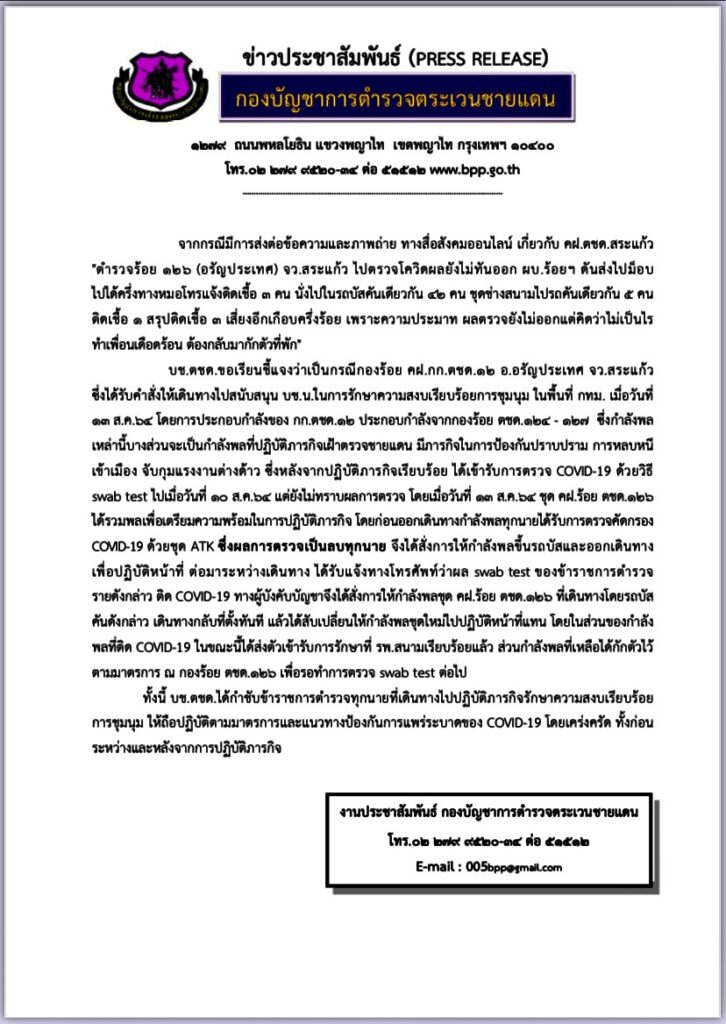 เมื่อวันที่ 16 สิงหาคม 2564 ผู้สื่อข่าวรายงานว่า กองบัญชาการตำรวจตระเวนชายแดน (บช.ตชด.) ชี้แจงถึงกรณีที่มีการส่งต่อข้อความและภาพถ่าย ทางสื่อสังคมออนไลน์ เกี่ยวกับ คฝ.ตชด.สระแก้ว “ตำรวจร้อย 126 (อรัญประเทศ) จว.สระแก้ว ไปตรวจโควิดผลยังไม่ทันออก ผบ.ร้อยฯ ดันส่งไปม็อบ ไปได้ครึ่งทางหมอโทรแจ้งติดเชื้อ 3 คน นั่งไปในรถบัสคันเดียวกัน 42 คน ชุดช่างสนามไปรถคันเดียวกัน 5 คน ติดเชื้อ 1 สรุปติดเชื้อ 3 เสี่ยงอีกเกือบครึ่งร้อย เพราะความประมาท ผลตรวจยังไม่ออกแต่คิดว่าไม่เป็นไร ทำเพื่อนเดือดร้อน ต้องกลับมากักตัวที่พัก” นั้น