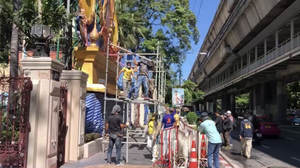 เมื่อวันที่ 18 สิงหาคม 2564 ที่สำนักงานตำรวจแห่งชาติ (ตร.) เจ้าหน้าที่จากสำนักเลขานุการ สำนักงานตำรวจแห่งชาติ, ตำรวจกองบัญชาการตำรวจสันติบาล และกลุ่มจิตอาสาจากพาณิชยการกรุงเทพฯ เข้าดำเนินการทำความสะอาดและปรับปรุงป้ายสำนักงานตำรวจแห่งชาติ และพระฉายาลักษณ์ สมเด็จพระนางเจ้าสิริกิติ์ พระบรมราชินีนาถ พระบรมราชชนนีพันปีหลวง ที่ถูกผู้ชุมนุมกลุ่มทะลุฟ้าและเครือข่ายทำกิจกรรมแสดงออกเชิงสัญลักษณ์ด้วยการสาดสีและขว้างปาสิ่งของเข้าใส่จนได้รับความสกปรกเสียหายในบางส่วน ซึ่งทางเจ้าหน้าที่ได้ทำนั่งร้านขึ้นไปทำความสะอาดและทาสีใหม่ ส่วนป้ายสำนักงานตำรวจแห่งชาติ หลังทำความสะอาดเบื้องต้นไปแล้วได้นำผ้าใบสีฟ้ามาคลุมทับไว้ชั่วคราว โดยเจ้าหน้าที่ได้เริ่มดำเนินการทำความสะอาดมาตั้งแต่ 08.00 น. และจะทำไปจนกว่าจะแล้วเสร็จ