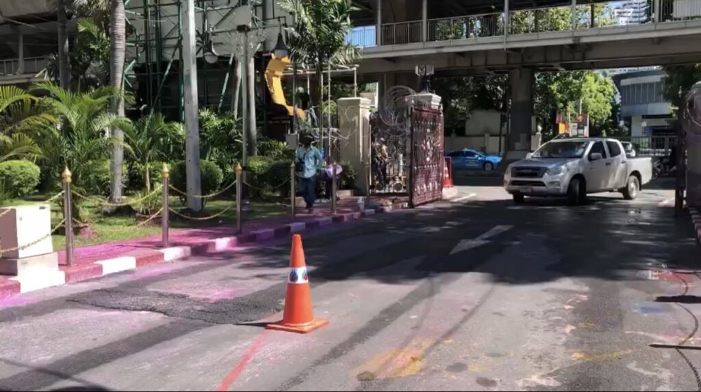 ส่วนบริเวณพื้นผิวจราจรและฟุตบาทภายในรั้วสำนักงานตำรวจแห่งชาติ บริเวณทางเข้าประตู 1 ถนนพระราม 1 ที่เปรอะเปื้อนและเต็มไปด้วยสีชมพูเต็มพื้นวานนี้ ขณะนี้ยังพบว่ามีร่องรอยสีชมพูตกค้างอยู่ แม้จะมีการทำความสะอาดไปบ้างแล้วก็ตาม ซึ่งเจ้าหน้าที่กำลังเร่งทำความสะอาดโดยได้ใช้แปรงและน้ำยาขัดพื้นเพื่อให้กลับมาสะอาดเป็นปกติให้มากที่สุด