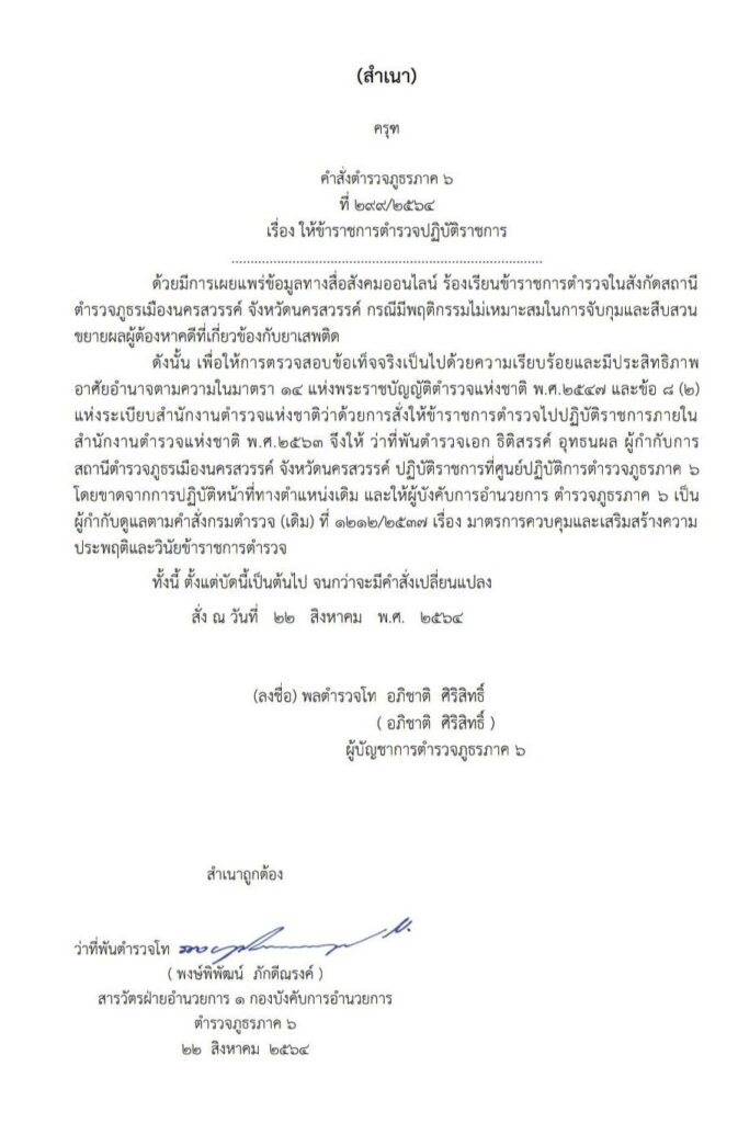 วันที่ 22 สิงหาคม 2564 พล.ต.ท.อภิชาติ ศิริสิทธิ์ ผู้บัญชาการตำรวจภูธรภาค 6 (ผบช.ภ.6) มีคำสั่งให้ พ.ต.อ.ธิติสรรค์ อุทธนผล ผกก.สภ.เมืองสครสวรรค์ ไปปฏิบัติราชการที่ ศูนย์ปฏิบัติการตำรวจภูธรภาค 6 (ศปก.ภ.6) ไว้ก่อน เพื่อไม่เป็นอุปสรรคต่อการตรวจสอบข้อเท็จจริงในพื้นที่