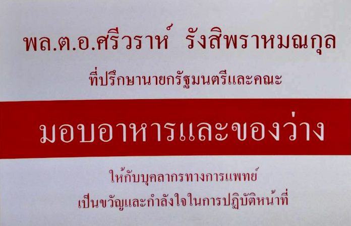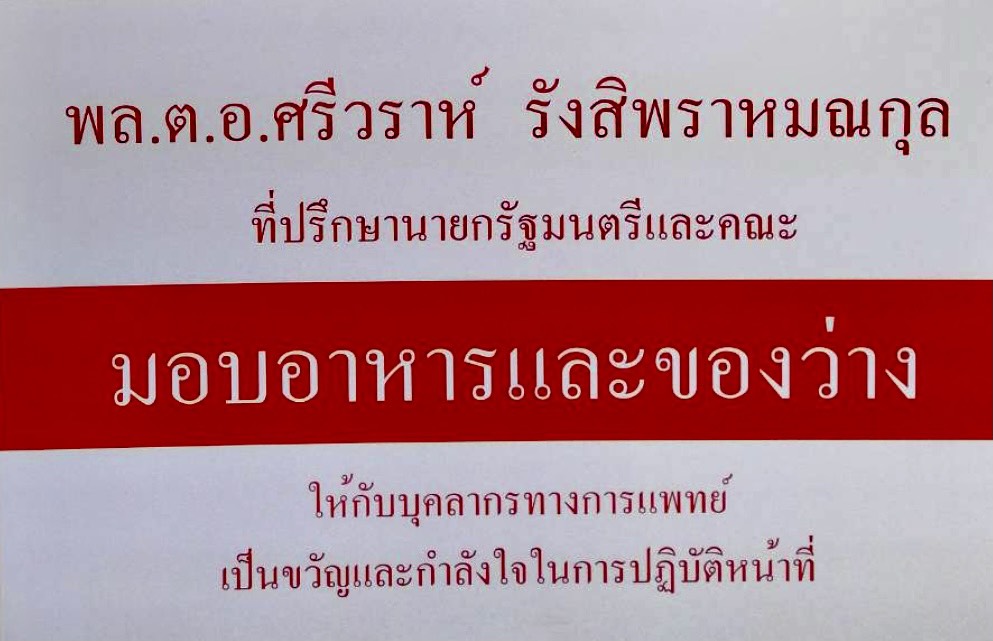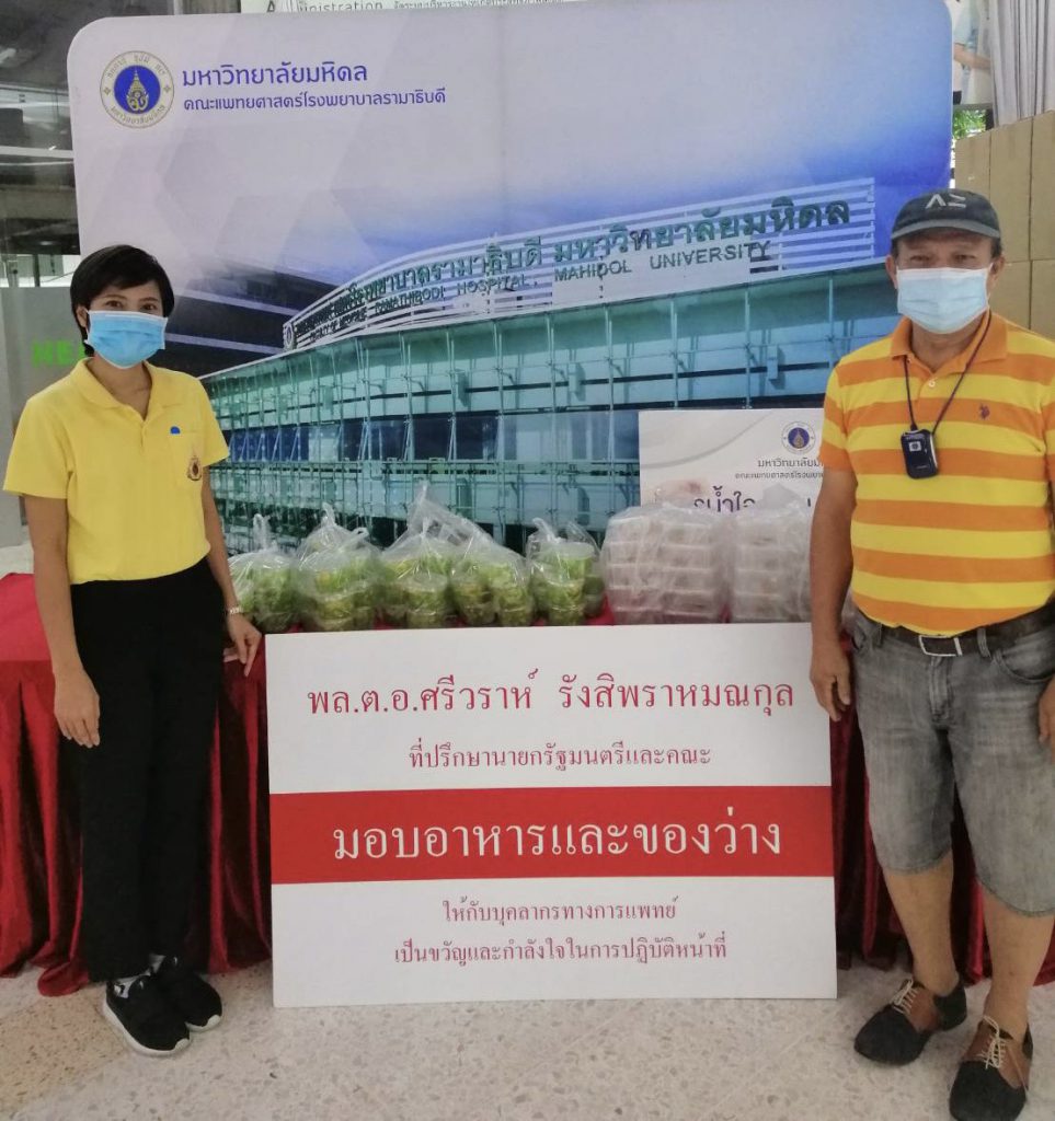 วันนี้ 31 สิงหาคม 2564 ผู้สื่อข่าวรายงานว่า พล.ต.อ.ศรีวราห์ รังสิพราหมณกุล ที่ปรึกษานายกรัฐมนตรี ได้มอบหมายให้ คุณนิพนธ์ กลิ่นบำรุง เดินทางมามอบอาหารกล่อง น้ำดื่ม ผลไม้ ให้กับคณะแพทย์ พยาบาล ที่โรงพยาบาลศิริราช โรงพยาบาลรามาธิบดี และโรงพยาบาลจุฬาลงกรณ์ โดยมีตัวแทนโรงพยาบาลศิริราช โรงพยาบาลรามาธิบดี โรงพยาบาลจุฬาลงกรณ์เป็นตัวแทนรับมอบ เพื่อเป็นกำลังใจให้กับคุณหมอ+พยาบาลที่ต้องทำงานหนักเสียสละรักษาผู้ป่วยโควิด ขอเป็นกำลังใจบุคลากรการแพทย์ ‘รพ.ศิริราช’ ทุก ๆ ท่านที่ร่วมปฏิบัติหน้าที่ช่วยเหลือผู้ป่วยสู้โควิด 19
