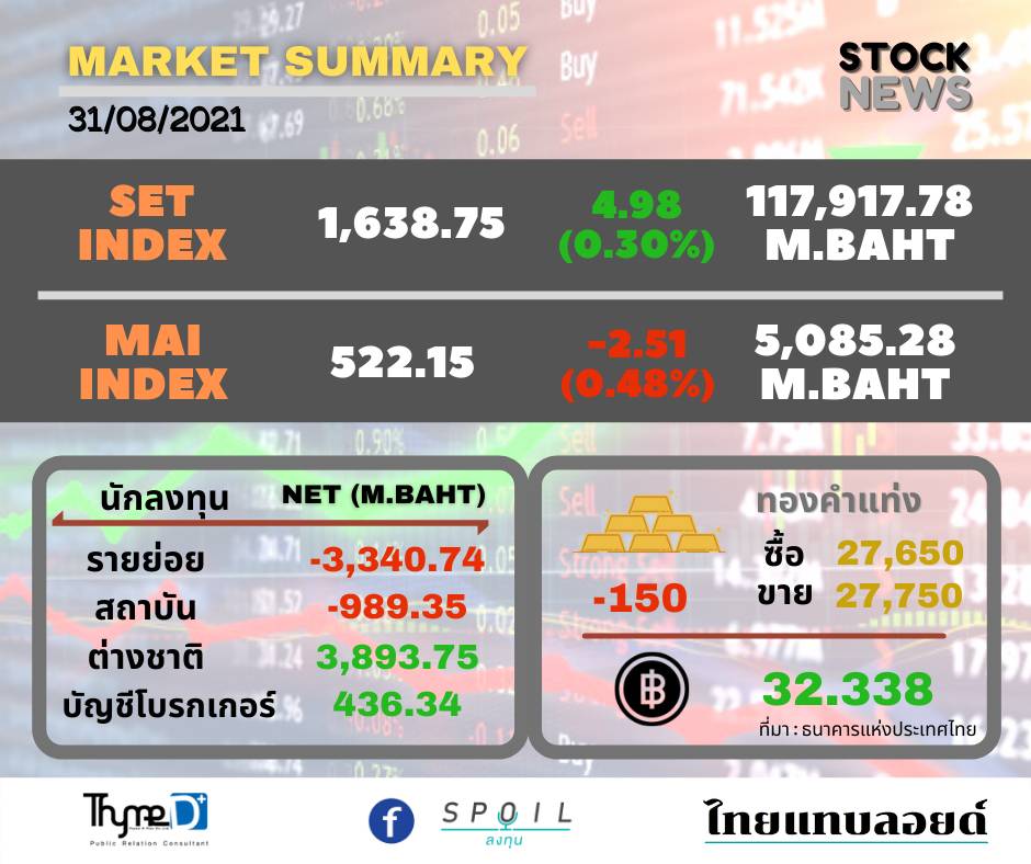 ตลาดหลักทรัพย์ ปิดวันนี้ที่ระดับ 1,638.75 จุด เพิ่มขึ้น 4.98 จุด (+0.30%) มูลค่าการซื้อขาย 117,917.78 ล้านบาท