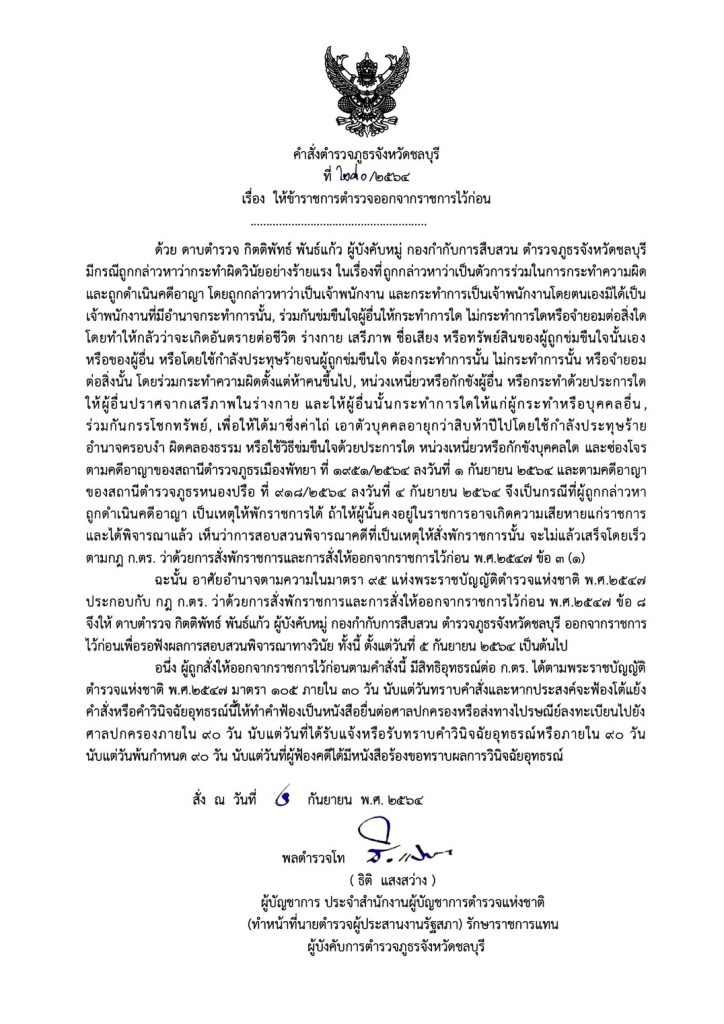 ให้ ดาบตำรวจ กิตติพัทธ์พันธ์แก้ว ผู้บังคับหมู่ กองกำกับการสืบสวน ตำรวจภูธรจังหวัดชลบุรี ออกจากราชการไว้ก่อนเพื่อรอฟังผลการสอบสวนพิจารณาทางวินัย ทั้งนี้ ตั้งแต่วันที่ 5 กันยายน 2564,เป็นต้นไป อนึ่งผู้ถูกสั่งให้ออกจากราชการไว้ก่อนตามคำสั่งนี้ มีสิทธิอุทธรณ์ต่อ ก.ตร. ได้ตามพระราชบัญญัติตำรวจแห่งชาติ พ.ศ.2547 มาตรา 105 ภายใน 30 วัน นับแต่วันทราบคำสั่งและหากประสงค์จะฟ้องโต้แย้งคำสั่งหรือคำวินิจฉัยอุทธรณ์นี้ให้ทำคำฟ้องเป็นหนังสือยื่นต่อศาลปกครองหรือส่งทางไปรษณีย์ลงทะเบียนไปยังศาลปกครองภายใน 90 วัน นับแต่วันที่ได้รับแจ้งหรือรับทราบคำวินิจฉัยอุทธรณ์หรือภายใน 90 วันนับแต่วันพ้นกำหนด 90 วัน นับแต่วันที่ผู้ฟ้องคดีได้มีหนังสือร้องขอทราบผลการวินิจฉัยอุทธรณ์ สั่ง ณ วันที่ 4 กันยายน พ.ศ. 2564 คำสั่งดังกล่าวระบุ