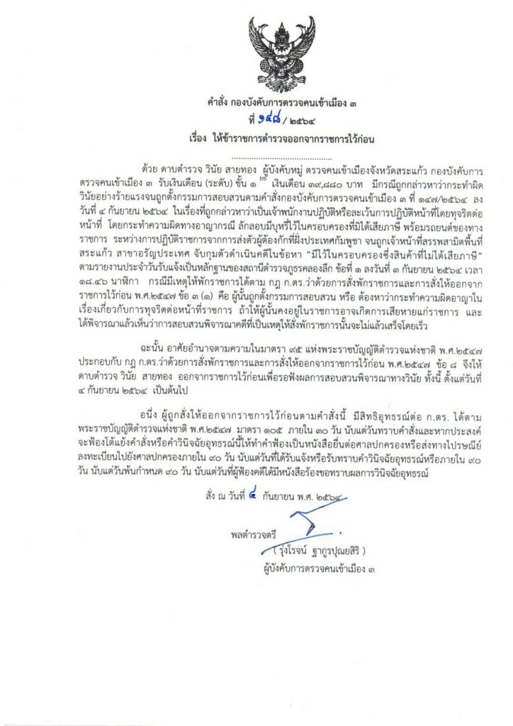 ซึ่งต่อมาในวันเดียวกัน ได้รับรายงานจาก พล.ต.ต.รุ่งโรจน์ ว่า ผู้กระทำผิดคือ ด.ต.วินัย สายทอง ผบ.หมู่ ตม.จว.สระแก้ว ได้กระทำผิดจริงตามข่าว โดย ด.ต.วินัยฯ ถูก จนท.สรรพสามิต พื้นที่สระแก้ว สาขาอรัญประเทศ จับกุมดำเนินคดี ข้อหามีไว้ในครอบครองซึ่งสินค้าที่ไม่ได้เสียภาษี และนำตัวส่งพนักงานสอบสวน สภ.คลองลึก จว.สระแก้ว และถูกเปรียบเทียบปรับ 336,000 บาท