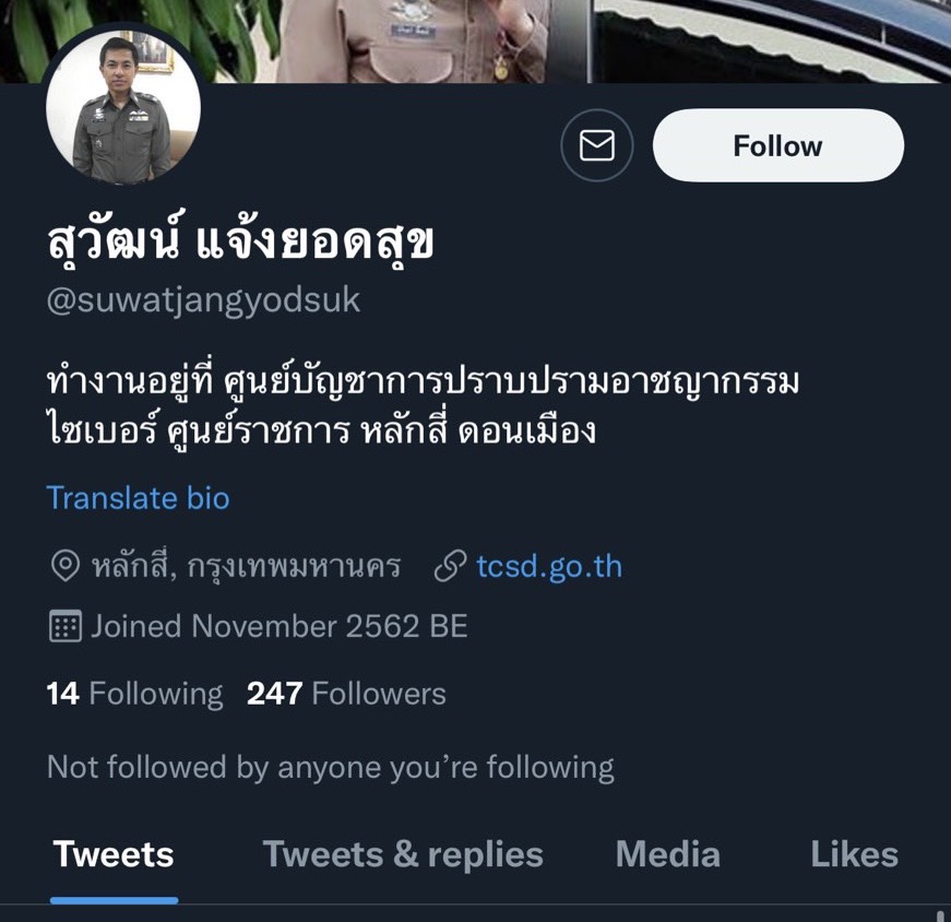 จากการตรวจสอบเบื้องต้น พบว่าบัญชีผู้ใช้ถูกสร้างขึ้นจากบุคคลอื่น ไม่ใช่เป็นบัญชีผู้ใช้ส่วนตัวของ พล.ต.อ.สุวัฒน์ แจ้งยอดสุข ตามที่แอบอ้างแต่อย่างใด ซึ่งสำนักงานตำรวจแห่งชาติได้ชี้แจงเบื้องต้นไปแล้วนั้น ทั้งนี้ ได้มีการประสานและแจ้งไปยังหน่วยงานที่เกี่ยวข้องในการดำเนินการปิดบัญชีผู้ใช้ดังกล่าวเป็นที่เรียบร้อยแล้ว พร้อมทั้งจะได้ดำเนินการสืบสวนหาตัวผู้กระทำความผิดมาดำเนินคดีตามกฎหมายต่อไป