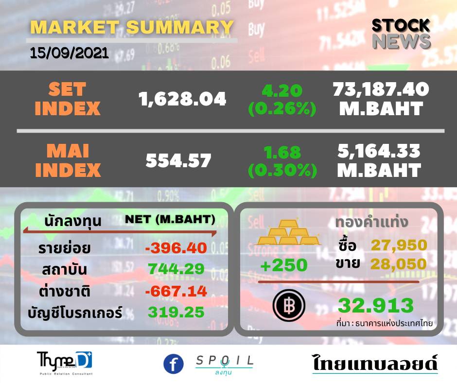 SET ปิดวันนี้ ที่ระดับ 1,628.04 จุด เพิ่มขึ้น 4.20 จุด (+0.26%) มูลค่าการซื้อขาย 73,187.40 ล้านบาท นักวิเคราะห์ฯ เผยตลาดหุ้นไทยวันนี้แกว่งบวกลบไม่มาก ประเด็นเงินเฟ้อสหรัฐเป็นบวกต่อตลาดหุ้นเอเชีย แต่กังวลตัวเลขเศรษฐกิจจีนส่งสัญญาณชะลอเป็นปัจจัยลบ แต่บ้านเราเก็งกำไรหุ้นกลาง-เล็กธีมเปิดเมืองคึกคัก แม้หุ้นใหญ่ฟรีโฟลตต่ำ กดดันตลาดบ้างแต่ไม่มากเหมือน 2 วันที่ผ่านมา ส่วนกระแสข่าวลือยุบสภาไม่ได้มีผลกระทบต่อตลาดมากนัก แนวโน้มวันพรุ่งนี้คาดฟื้นตัวต่อทิศทางเป็นบวก ให้แนวรับ 1,615-1,620 จุด แนวต้าน 1,643-1,660 จุด