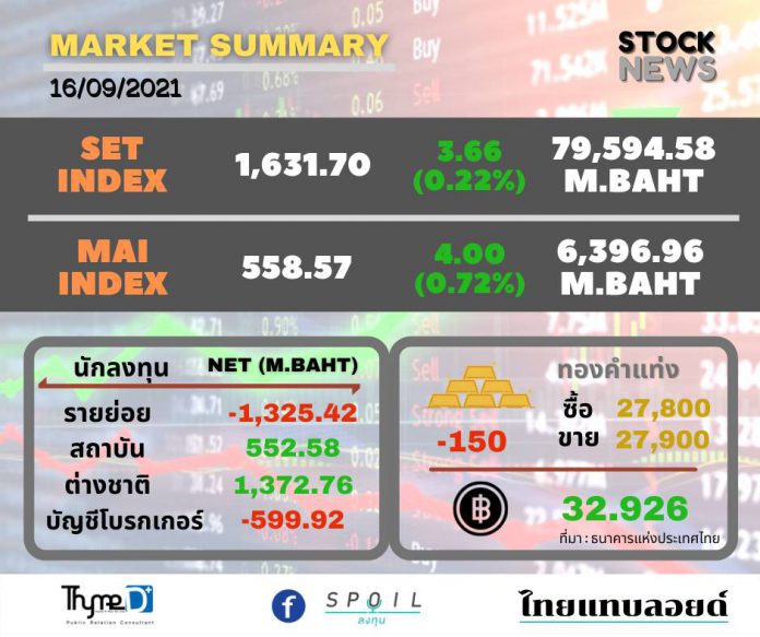 ตลาดหลักทรัพย์ ปิดวันนี้ ที่ระดับ 1,631.70 จุด เพิ่มขึ้น 3.66 จุด (+0.22%) มูลค่าการซื้อขาย 79,594.35 ล้านบาท