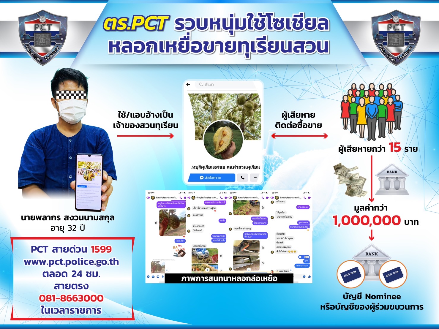 เมื่อวันที่ 30 กันยายน 2564 ที่สำนักงานตำรวจแห่งชาติ (ตร.) พล.ต.อ.ดำรงศักดิ์ กิตติประภัสร์ รองผู้บัญชาการตำรวจแห่งชาติ (รอง ผบ.ตร.) ในฐานะผอ.ศูนย์ปราบปรามอาชญากรรมทางเทคโนโลยีสารสนเทศ สำนักงานตำรวจแห่งชาติ หรือ PCT พล.ต.ท.ปรีชา เจริญสหายานนท์ ผู้ช่วย ผบ.ตร., พล.ต.ต.ไตรรงค์ ผิวพรรณ รอง ผบช.ภ.6 ในฐานะหัวหน้าชุดปฏิบัติการ PCT ชุดที่ 4 แถลงการจับกุมผู้ต้องหาหลอกขายทุเรียน ผู้เสียหาย 15 ราย มูลค่าความเสียหายกว่า 1,000,000 บาท