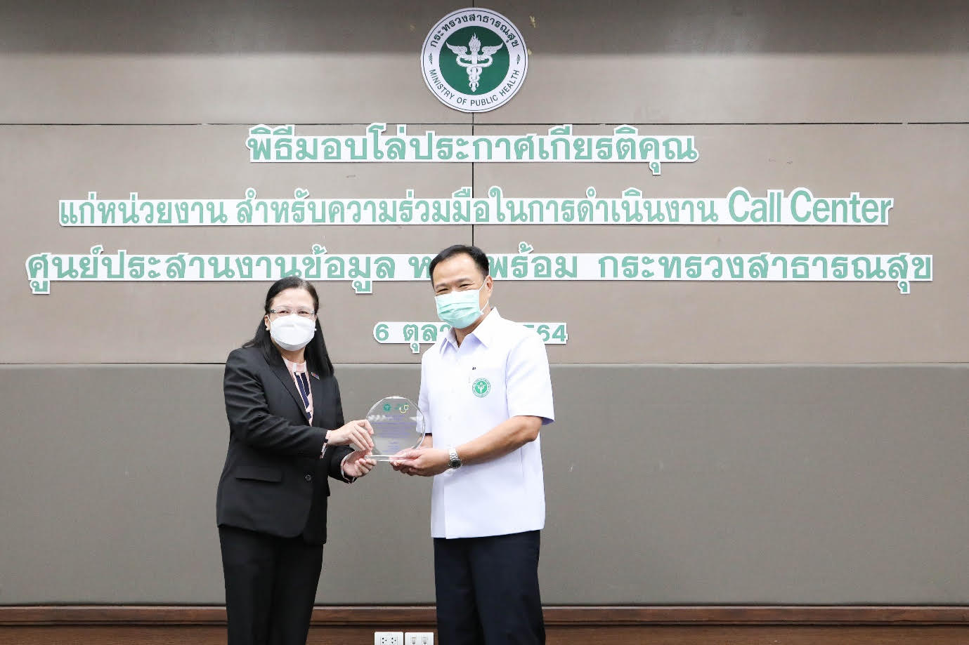 นางวรางคณา วงศ์ข้าหลวง (ซ้าย) รองกรรมการผู้จัดการ ธนาคารเพื่อการส่งออกและนำเข้าแห่งประเทศไทย (EXIM BANK) รับมอบโล่ประกาศเกียรติคุณจากนายอนุทิน ชาญวีรกุล (ขวา) รองนายกรัฐมนตรีและรัฐมนตรีว่าการกระทรวงสาธารณสุข ในฐานะที่ EXIM BANK เป็นหนึ่งในหน่วยงานที่ให้ความร่วมมือในการให้บริการ Call Center ศูนย์ประสานงานข้อมูล “หมอพร้อม” ณ กระทรวงสาธารณสุข เมื่อวันที่ 6 ตุลาคม 2564 ทั้งนี้ EXIM BANK ร่วมปฏิบัติหน้าที่ Call Center ให้บริการข้อมูลประชาชนเกี่ยวกับการฉีดวัคซีนป้องกันโควิด-19 ผ่านระบบ “หมอพร้อม” ตั้งแต่ต้นเดือนมิถุนายน 2564